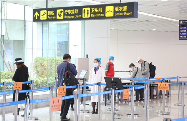 到港旅客接受疫情防控檢查。(余財旺攝)