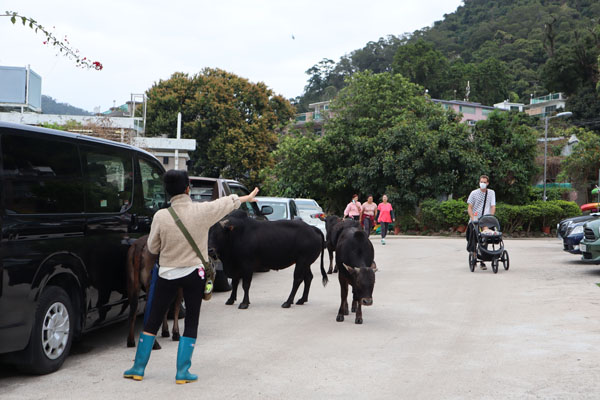 有耕種經歷的李馬田,對於牛隻的生存狀況容易理解,但城市人Camille每天最少用四個半小時巡村觀察牛隻狀況,風雨不改,這究竟是怎麼一回事?Camille說,十四鄉有很多村民及外來者做牛義工,但包括她在內的牧者有3人,每人每天分地方巡視兩三次,主要防止牛隻行出西沙路及石屎車路,「5點鐘起身,半小時後出門,早餐也來不及吃,若情況順利,8時多可巡完,若有牛隻行了出石屎路,要搞到11時,下晝4時多再巡,巡兩小時,6時多可收工」,別人收工有糧出,她純粹是義工,這種生活已過了好幾年。