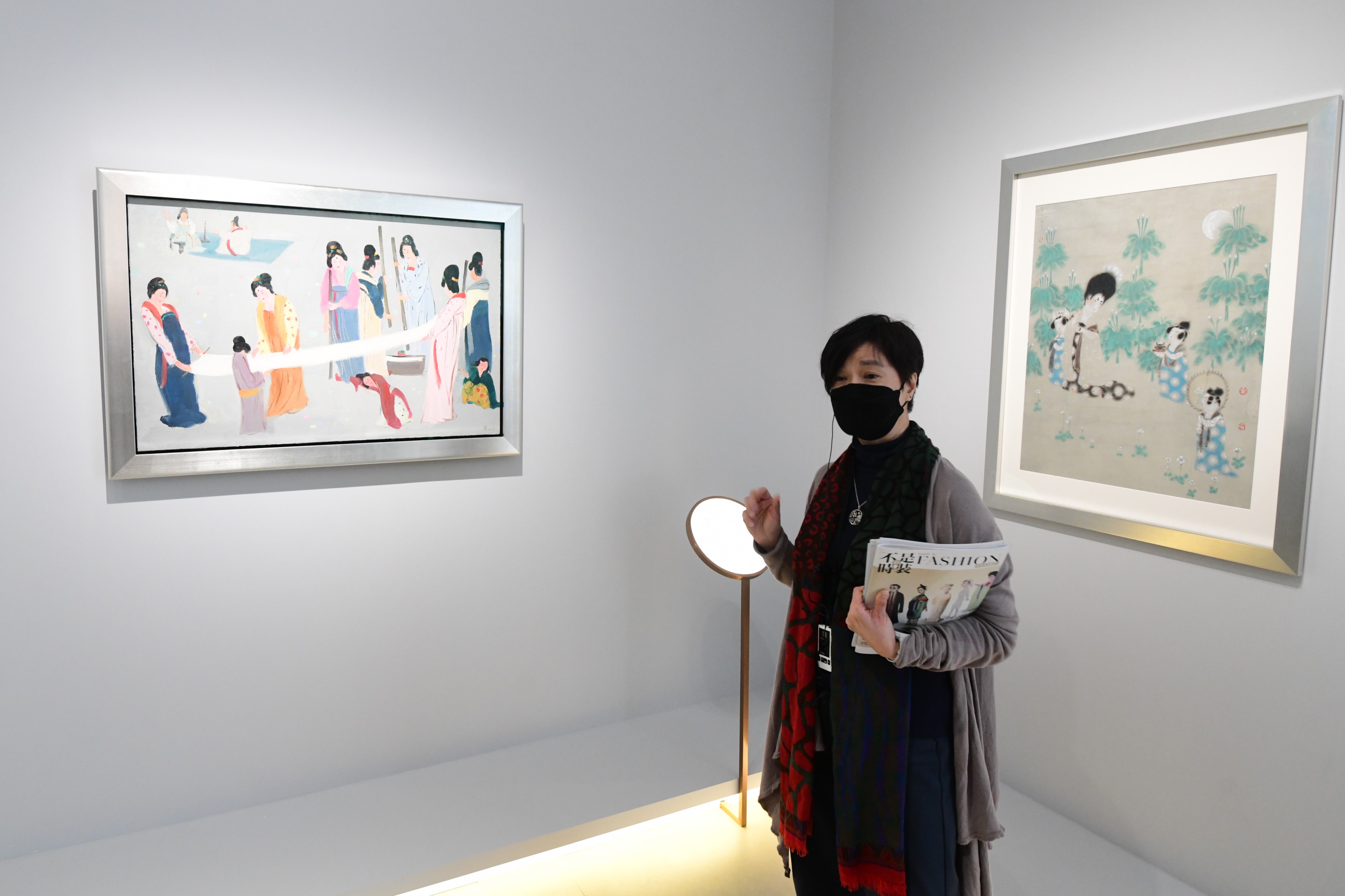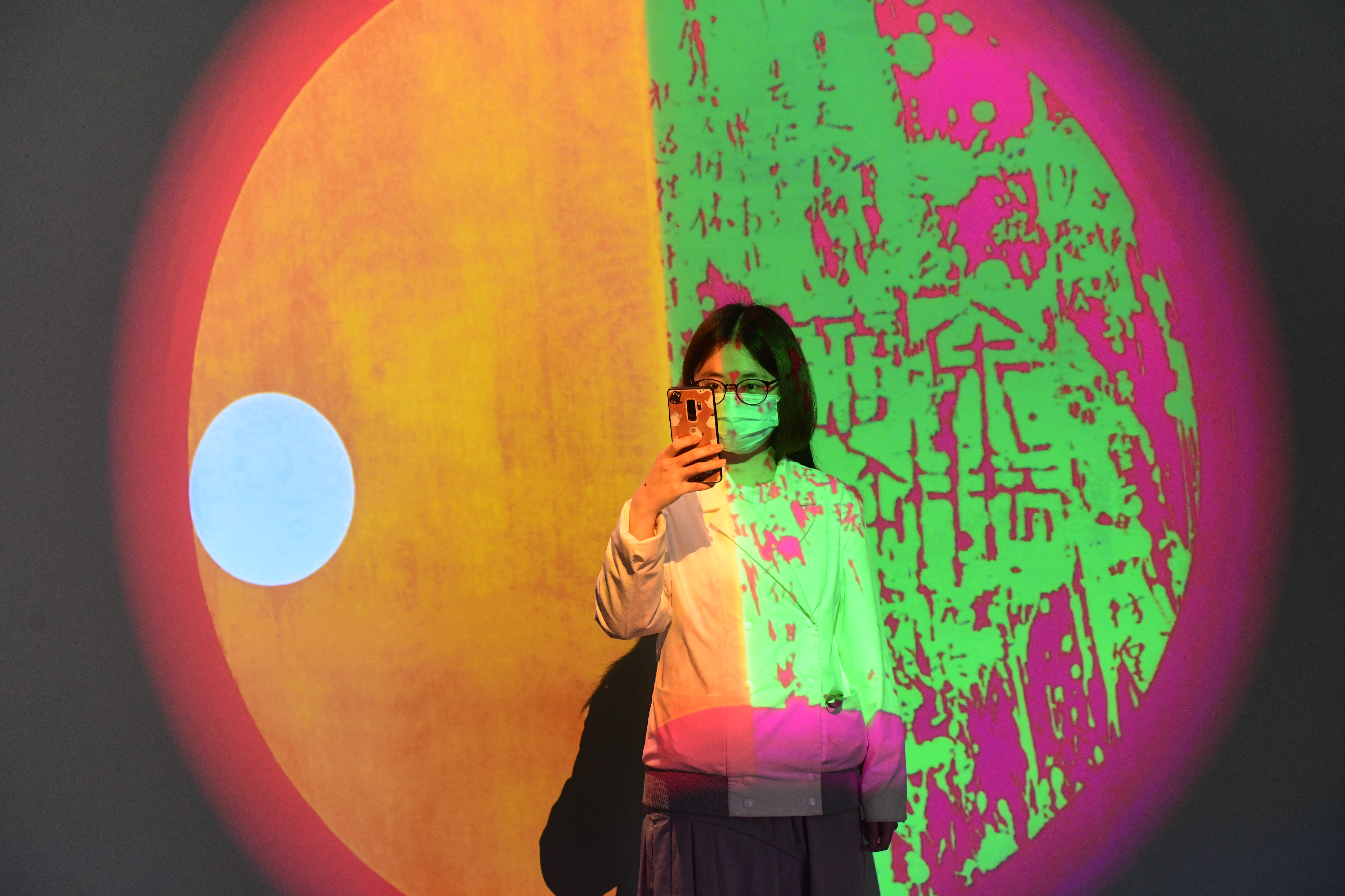 場內有互動藝術裝置,通過投影讓觀者將畫作「穿」上身拍照打卡。