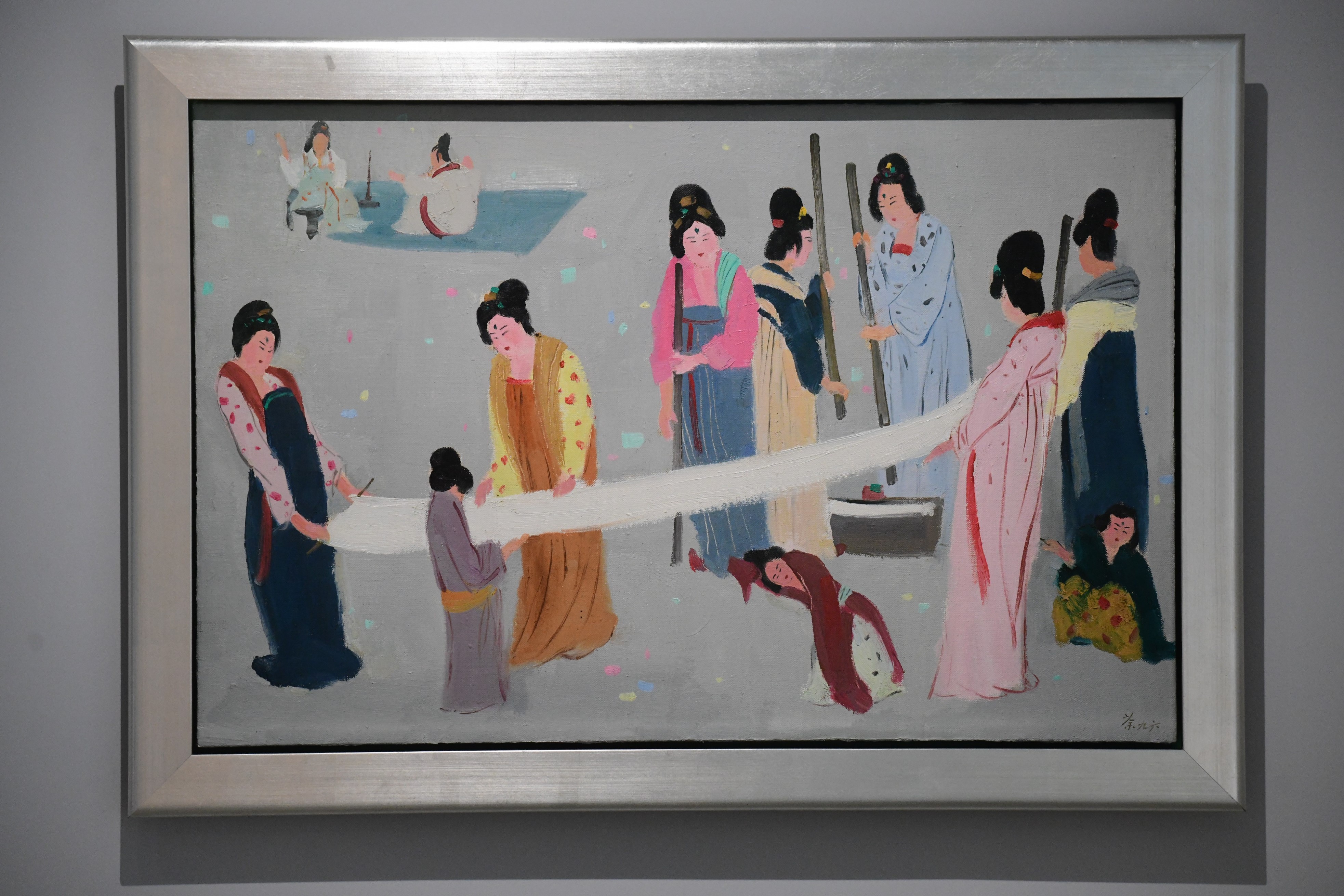 讀者在購買衣飾時會考量顏色、手工、物料、圖案,還有什麼元素?有人說時尚是個圈,不妨參考展品於不同時代的流行元素。吳冠中「古韻新腔」系列作《搗練聲裏辨腔》中的婦女體態豐腴,穿着古韻服裝,頭髮梳著中晚唐流行的峨髻,從畫中人的服飾、髮型、體態來看,處處流露唐朝味道。據朱瑞平介紹,此系列畫作是吳冠中從古畫中汲取養分,再用新手法——油畫去創作,「他不單是臨摹古代書畫作品,而是加入新意,再創作。」