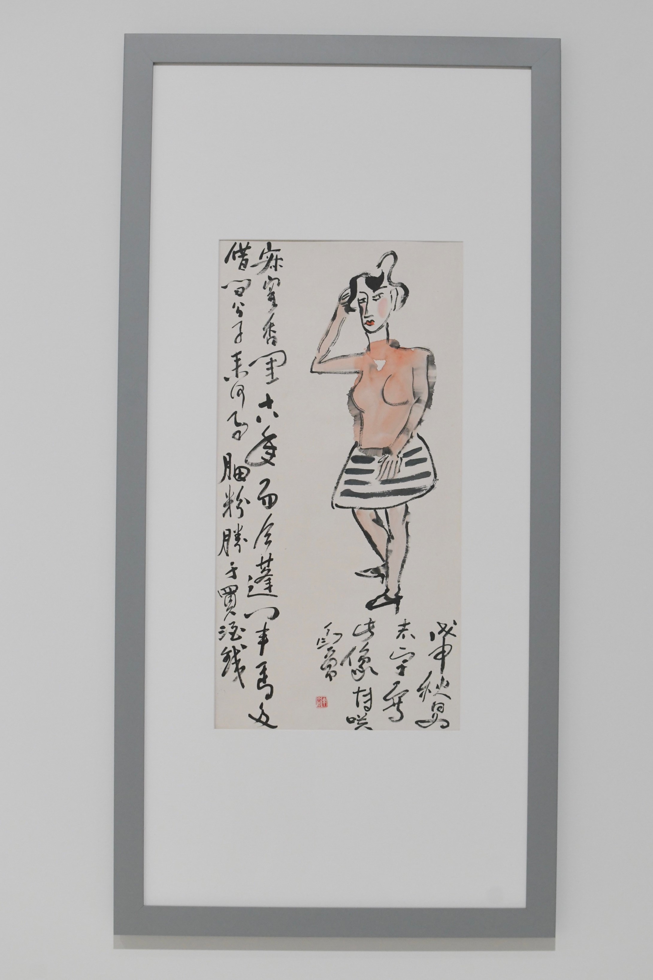 而丁衍庸的作品剛好相反,以水墨展現西方藝術的意趣。水墨展品《現代仕女》描繪一位摩登女郎,朱瑞平說這多數是丁衍庸為課堂學生畫的肖像。畫家以簡潔的筆觸畫出頭髮捲曲、身穿T恤、黑白間條短裙的女性,加上高跟鞋,正是1960年代的時裝特色。
