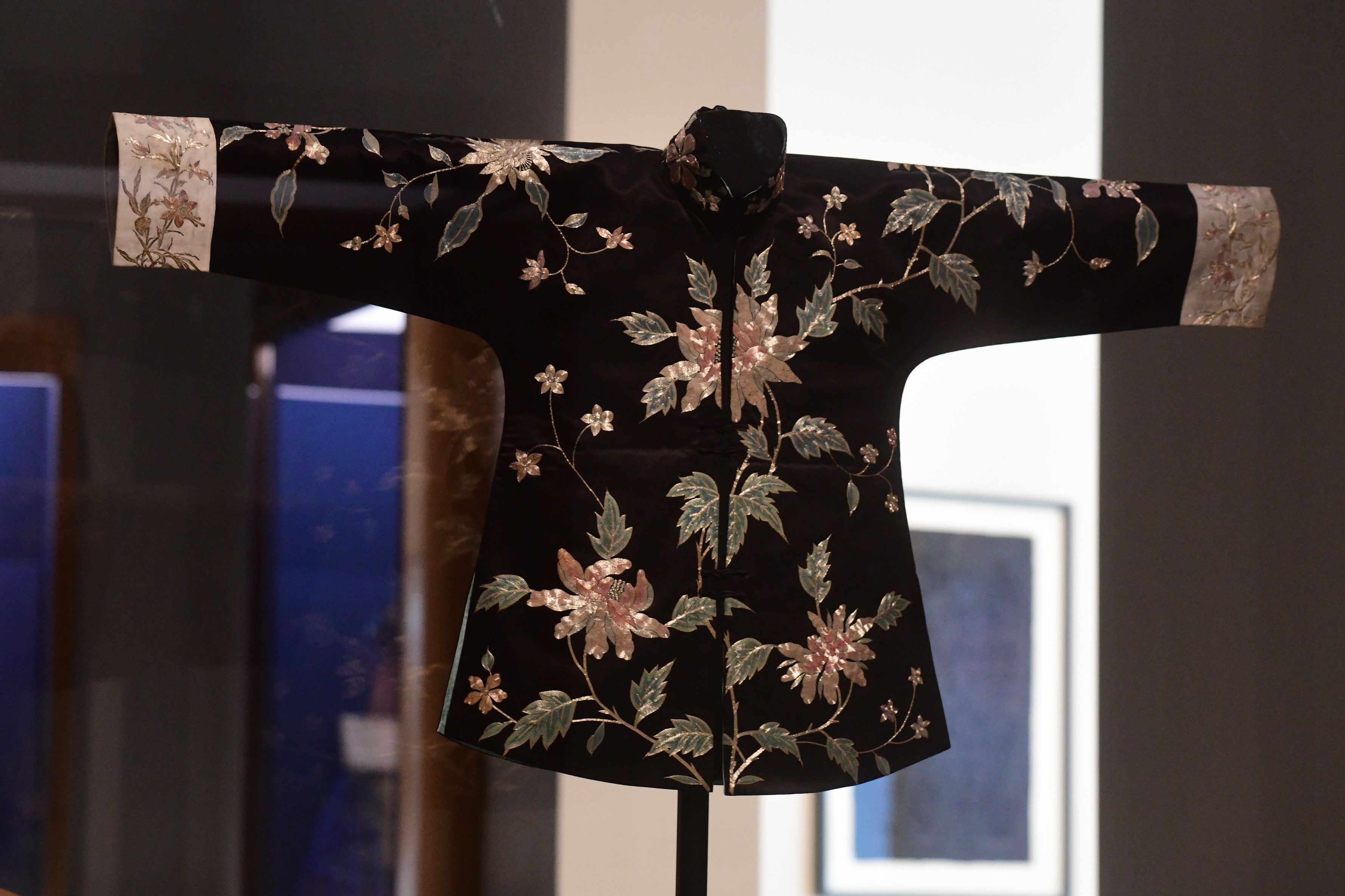 古著文化近年受到不少人追捧,不同時代的懷舊古著背負歷史意義和文化,展場內展示很多中式古著,它們的顏色、圖案、花紋、款式相當獨特。如一件在昏暗的展場內仍閃閃生光的「刺繡藍地花卉紋女袍」,袍服用了盤金繡法,以金線釘縫於面料上的繡法,金線更是以黃金錘箔,再撚線而成的純金線,工序繁複。再看展品刺繡立體,花卉圖案精緻,可以猜測這件衣服定不是一般平民百姓擁有的。