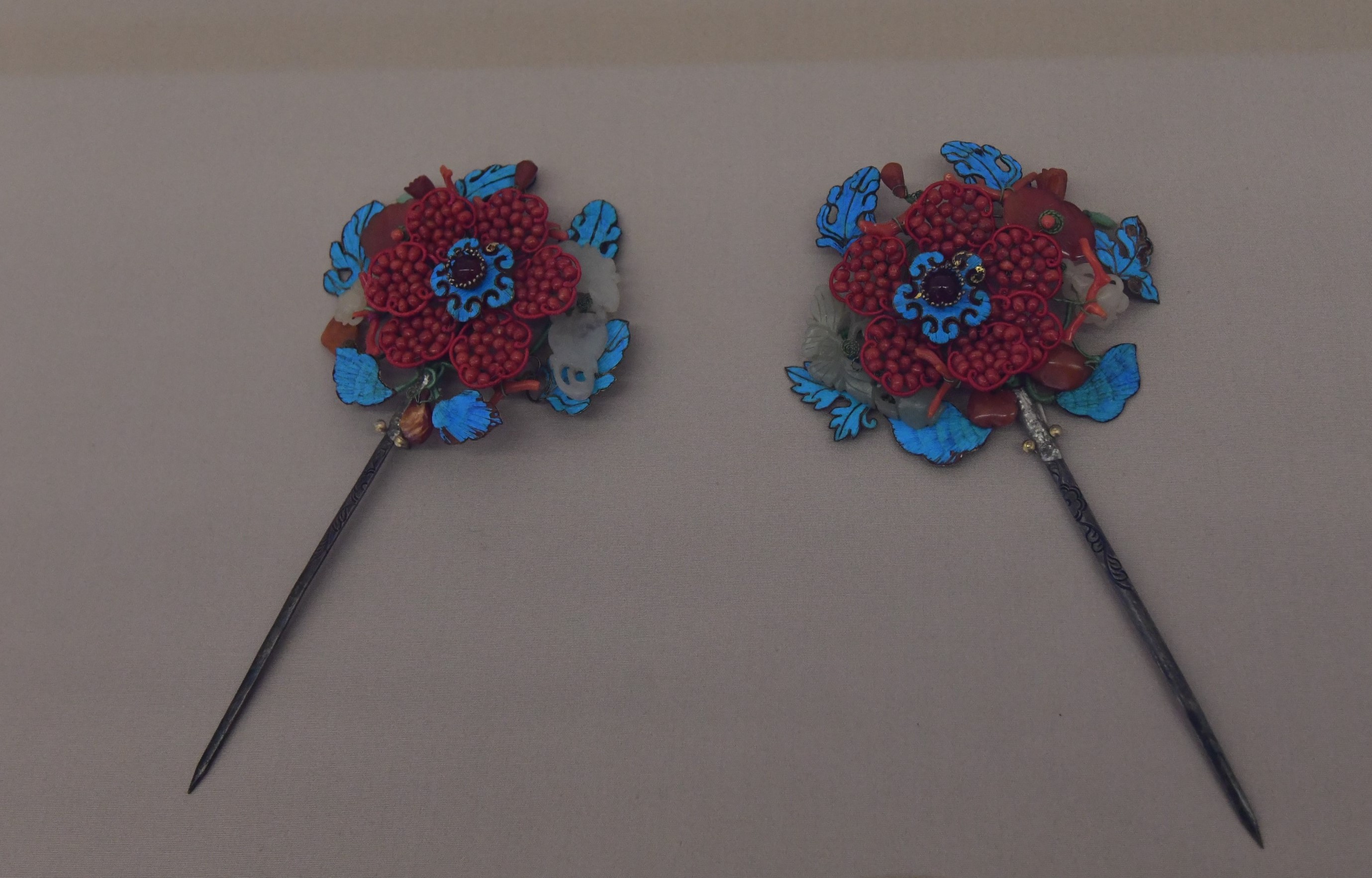一件矜貴的衣服,就要搭配精緻的髮飾,點翠就是穿搭的點睛之筆。在曹植的《七啟》也寫道:「戴金搖之熠燿,揚翠羽之雙翹。」朱瑞平表示:「點翠是中國傳統製作金銀首飾的工藝。翠,是翠羽,即翠鳥的羽毛。據說翠羽必須在活鳥身上拔取,顏色才會鮮明,髮簪製作不易。」展品「點翠嵌青玉琥珀珊瑚梅花簪」翠綠與珊瑚紅的撞色,與花朵造型的設計更彰顯製作的精細。