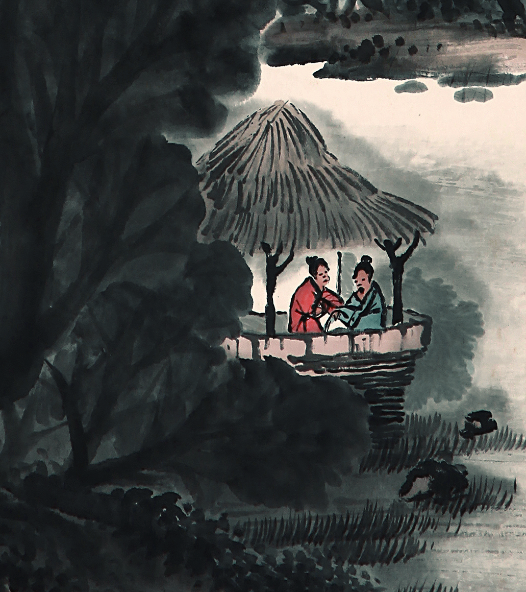 胡郯卿《溪山論古圖》中天的朦朧,山的隱約,樹的繁茂,和人的悠然自得,很好地統一在畫家為觀者營造的意境之中。臨池亭裏的二人,相互論古,一紅一藍,恰到好處地點綴了整幅作品蒼茫深遠的遏抑氛圍。此外,畫家用豐富細節與整體和諧的處理,將畫作推向更高層次。從畫面中亭上的細密稻草,山間的疏密小草,籬笆的點狀構成,觀眾不難看出:寫意國畫也是有細節的,也是值得推敲考究的。