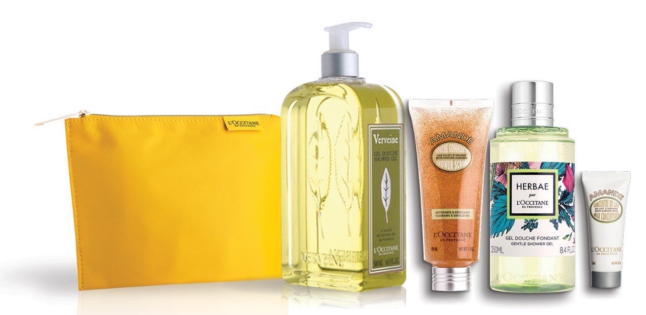 清新沐浴護理套裝,港幣500元 (原價港幣764元)。包括精美化妝袋、馬鞭草沐浴啫喱500ml、杏仁磨砂沐浴啫喱200ml、 綠野遊蹤沐浴啫喱250ml、杏仁緊膚乳20ml。(銅鑼灣店限定)