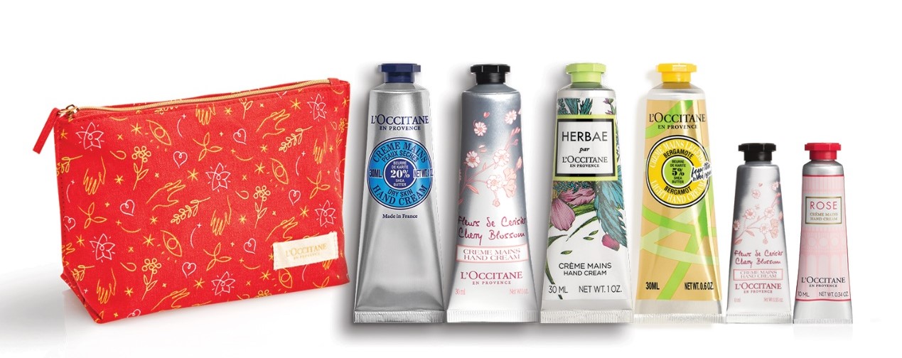 皇牌潤手霜套裝,港幣288元 (原價港幣490元)。包括精美化妝袋、乳木果潤手霜 、櫻花潤手霜30ml、綠野遊蹤潤手霜 30ml、 乳木果佛手柑輕盈潤手霜 30ml、櫻花潤手霜10ml、玫瑰潤手霜 10ml。(尖沙咀店5月16日限定)