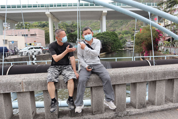 鄭裕光(左)與姚志明在水坑上的橋壆閒坐笑談紗廠女工,恍惚回到少年時。