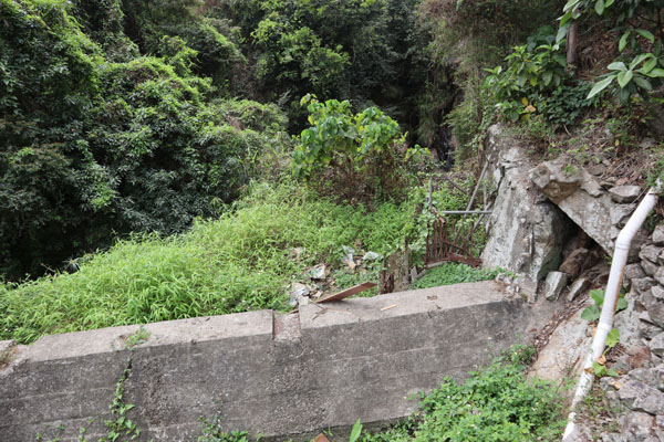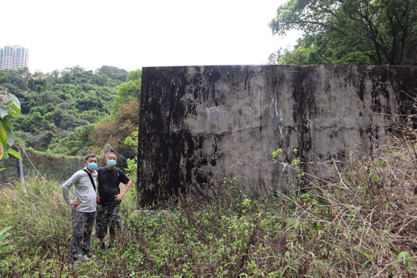 姚志明(左)及鄭裕光重訪40多年未到過的大水缸,只見已被矮草叢包圍。