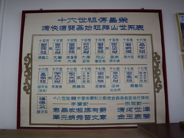 深井村公所內陳列的傅族祭祖世系圖,顯示祖先來深井(清快塘)開基立業已有幾百年。