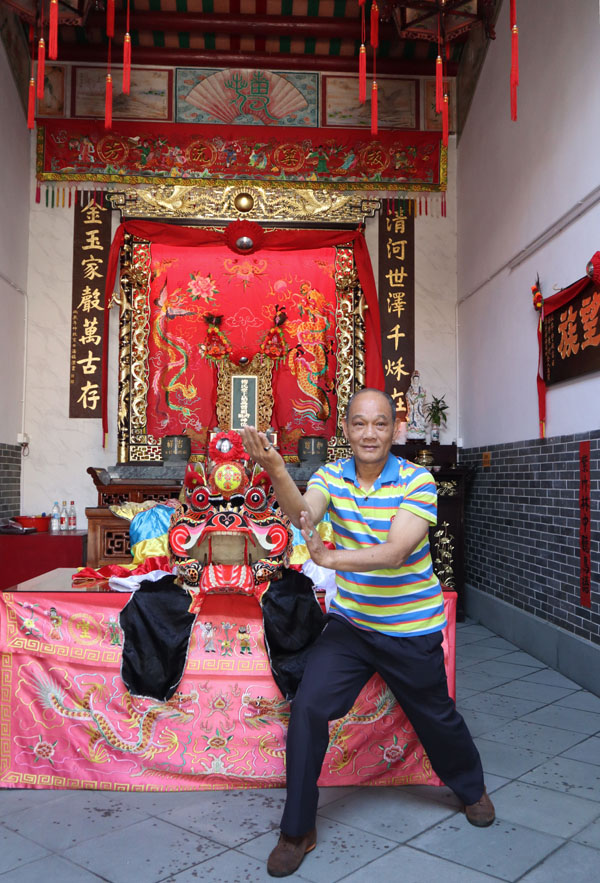 傅天宋在深井傅氏宗祠內展示功夫,他期望舞麒麟能承傳下去。