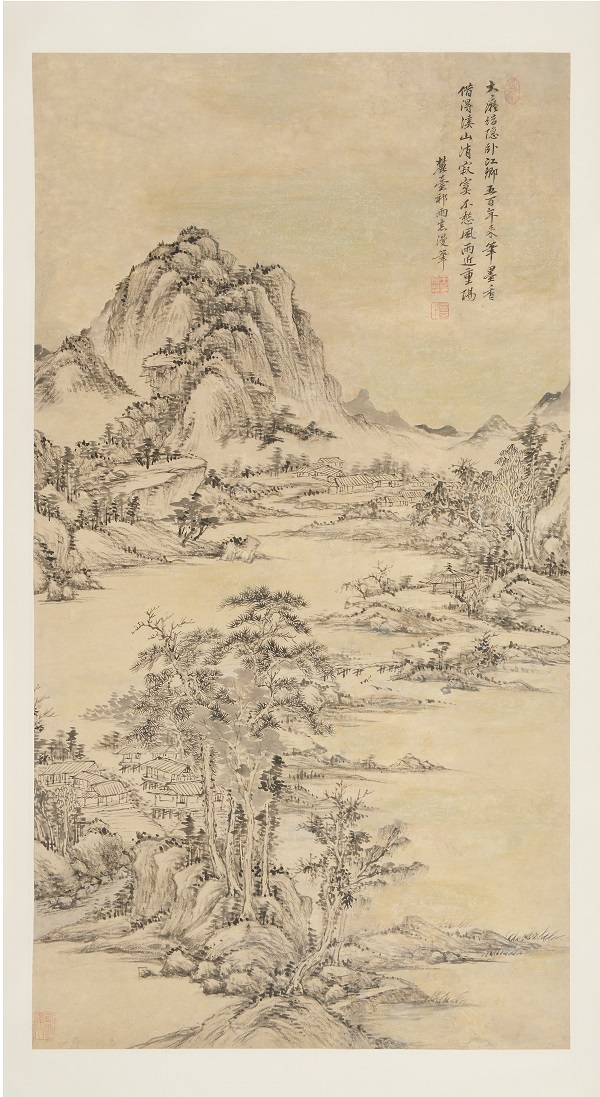款識:大癡結隱臥江鄉,五百年來筆墨香。借得溪山消寂寞,不愁風雨近重楊。麓台祁雨意漫筆。
