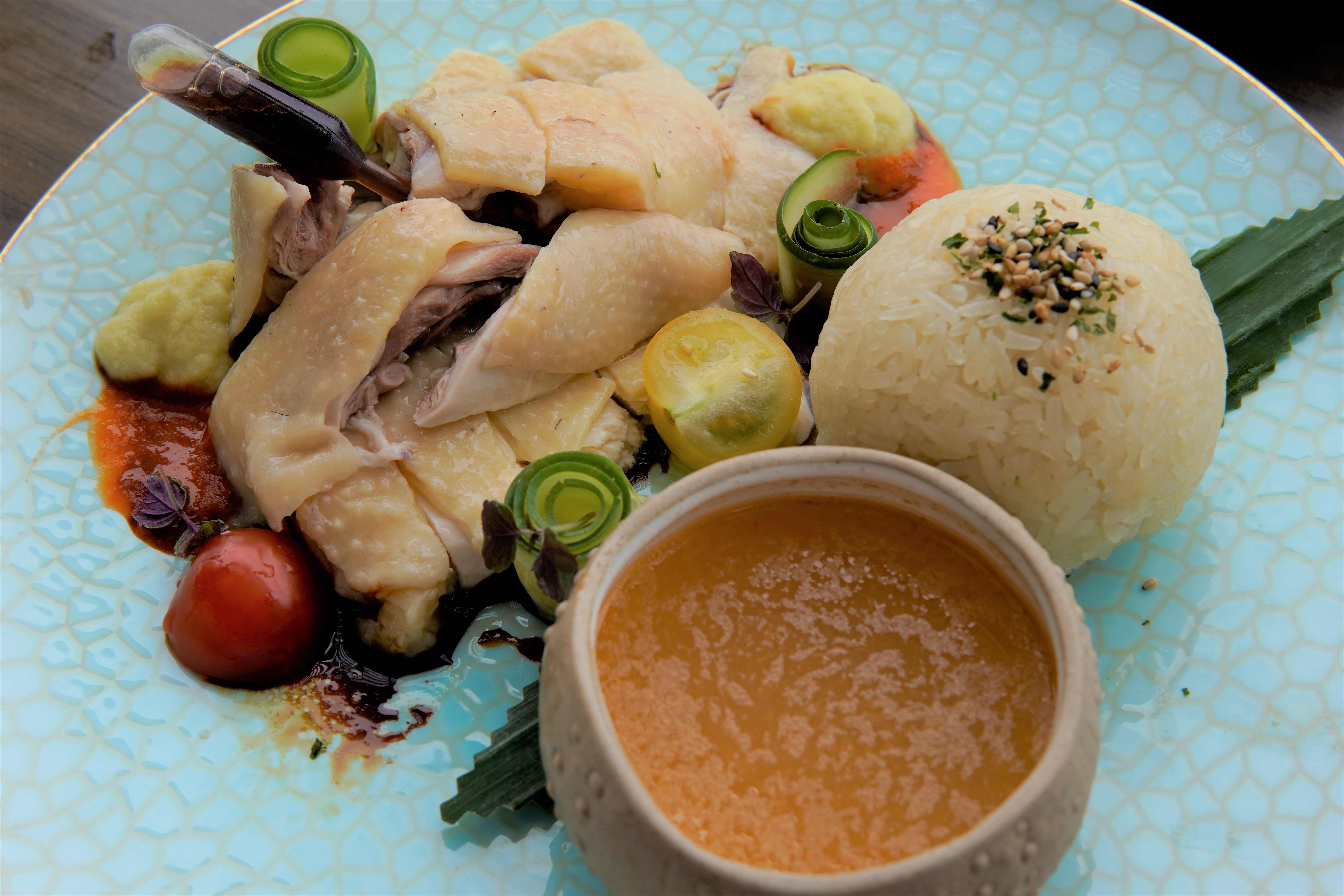 海南麻雞飯,油飯相比普通的海南雞飯更有咬口,搭配的蝦湯熬製7至8小時,鮮味十足。