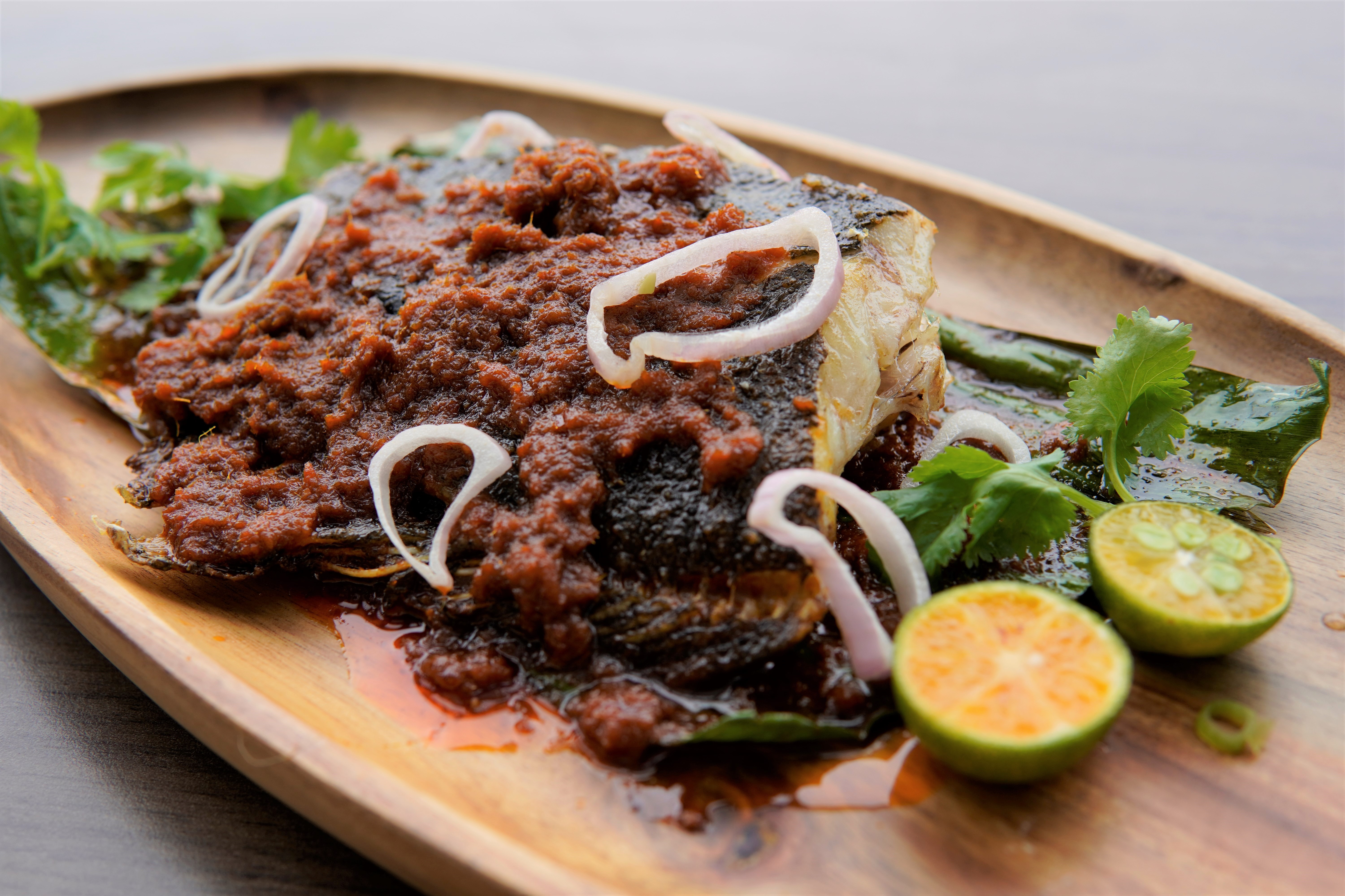 馬來參巴汁燒多寶魚,張師傅表示,為保持傳統味道,參巴汁的原材料均源自新加坡。