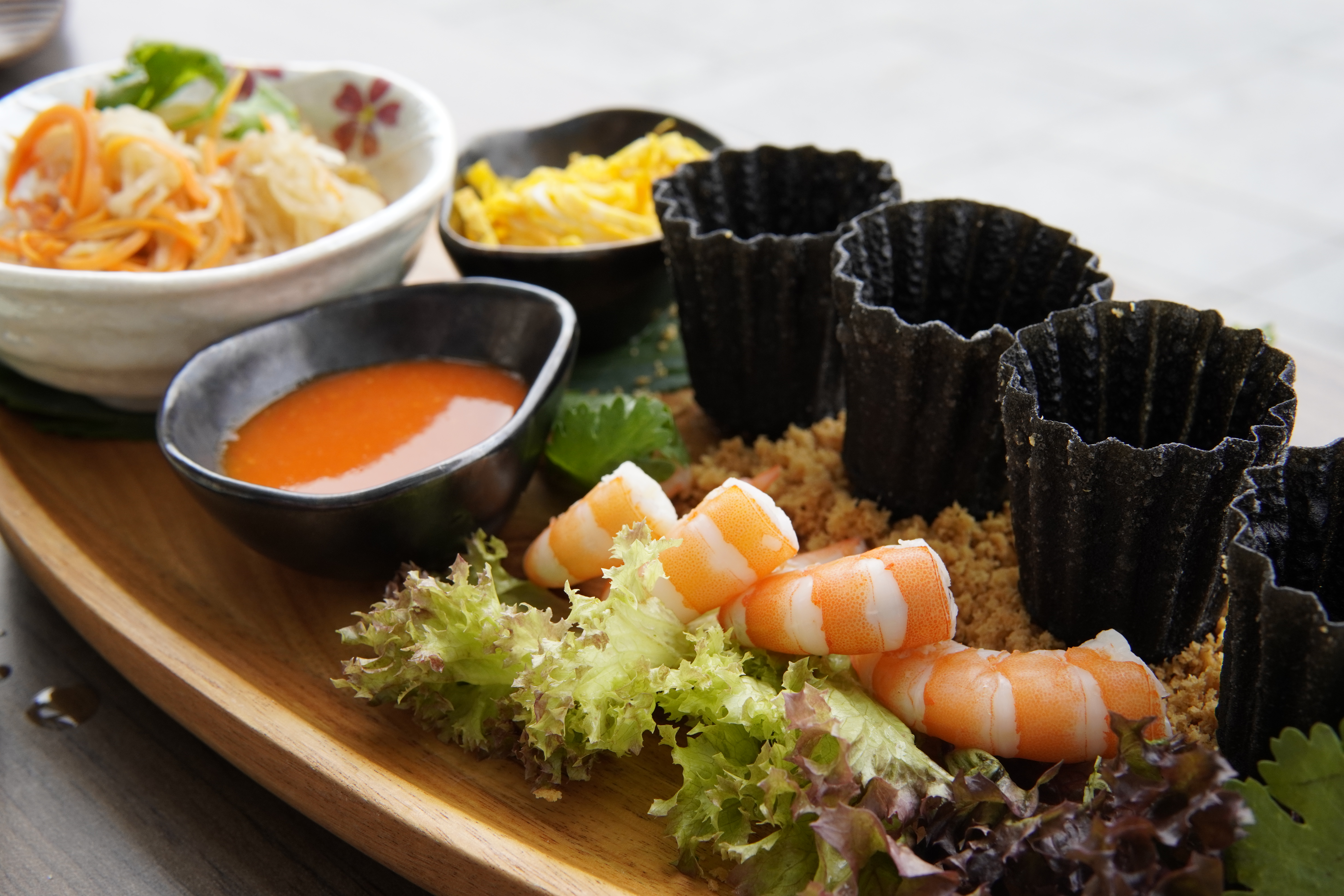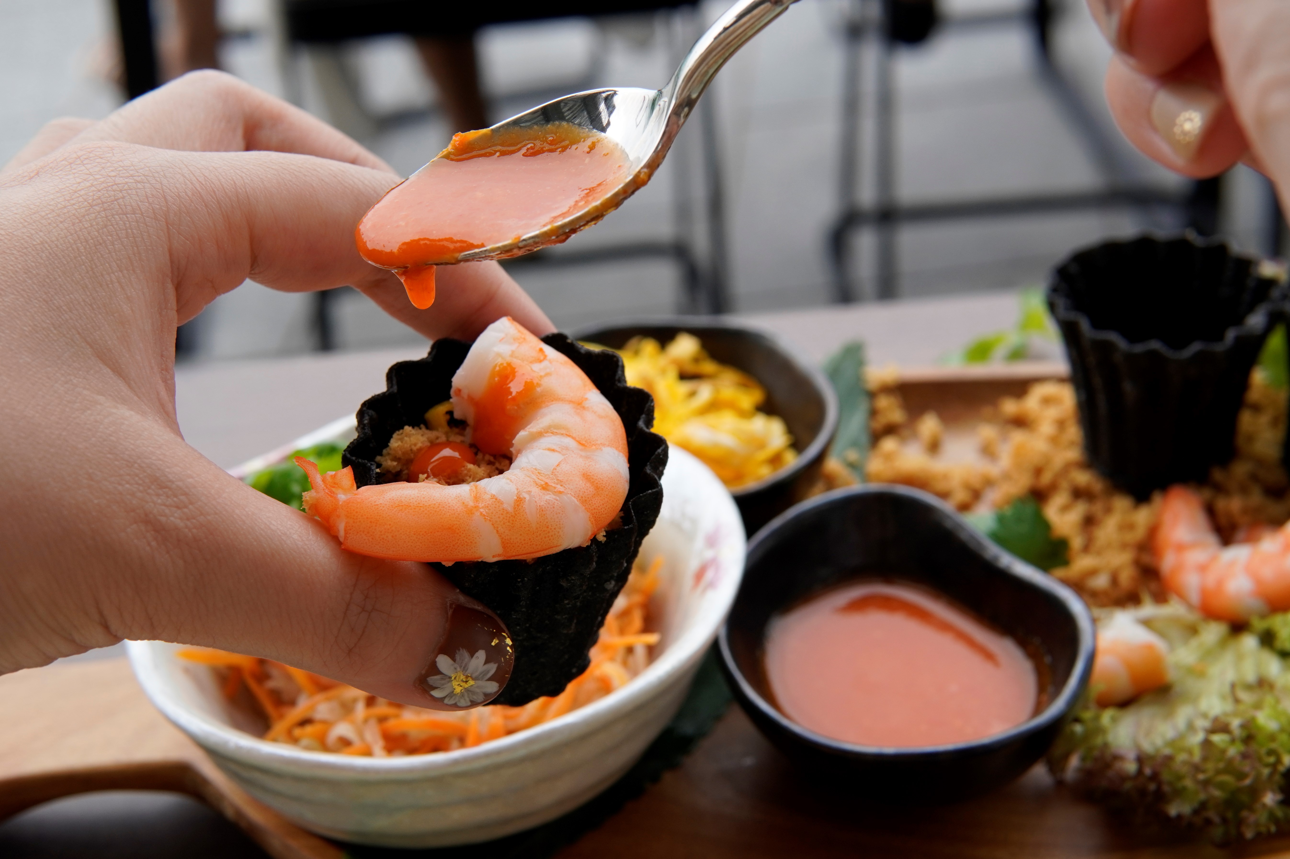 娘惹黑炭小金杯,小金杯是馬六甲有名的娘惹菜小食。餐廳用上日本黑竹炭調製金杯仔,食客更可按自己喜好,加入蝦等配料及調味,好玩又美味。