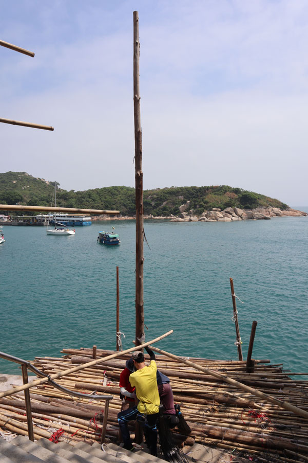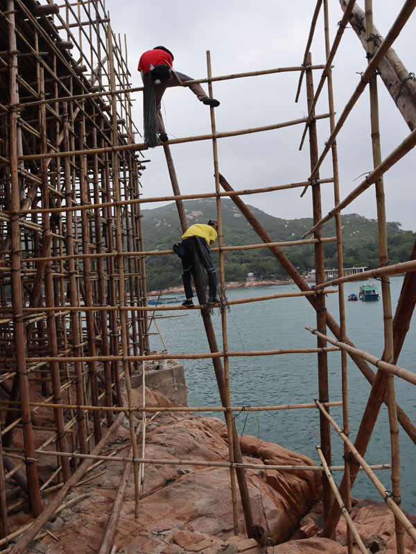 相比在平地搭戲棚,在懸崖邊搭的難度高很多,建造程序亦不同。李師傅說,在平地,是先做戲棚,最後才做地台(即舞台),但在蒲台島,是先做突出崖邊的舞台,借其力度做大棚,「崖邊底部是凹凸不平的岩石,距舞台最高點近30呎,在下面我們慢慢篤柱上來,用的力氣比平地大很多」,更要命的是,這小島風勢很大,師傅第一日做地台就遇上七級風,托着杉木、竹枝沿梯級往崖底時,人也被吹得有點晃動。