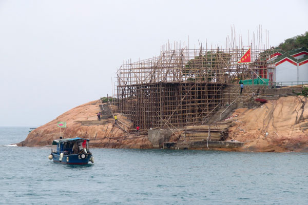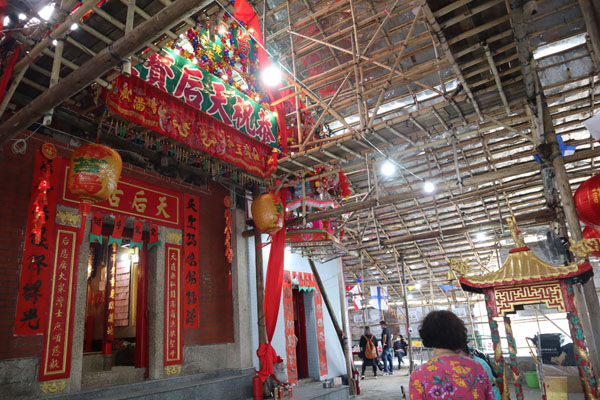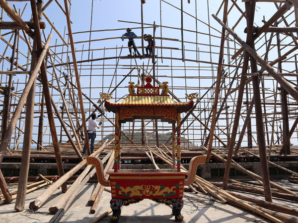 師傅正在天后廟前做「擔通」,即棚頂。他們身後不多遠是懸崖大海。
