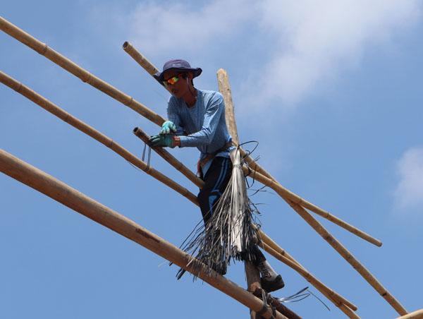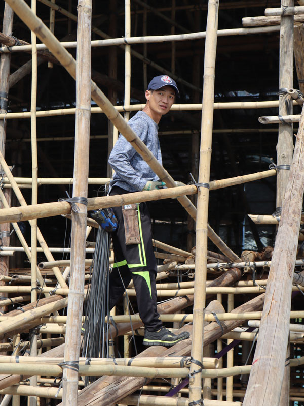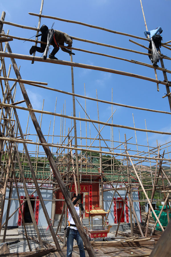 為理解搭戲棚是怎麼一回事,早前天後誕前後走訪蒲台島及長洲,看師傅們搭棚。看的天數只3天,每次只看2小時,基本上難窺全豹,但粗淺知道這是一項非常重視團隊合作的技藝。如搭棚頂即他們所稱的擔通,需要在地面的師傅傳遞不同長度的竹枝給棚上師傅,紮在不同部位,又如豎立支柱作用的杉木,要合幾人之力。