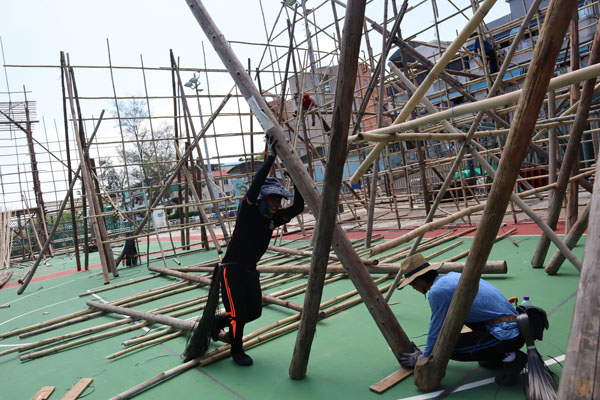 李家俊師傅爬到搭建中的北帝廟球場戲棚尖頂位,紮好這個「金字」,以備做對戲棚尺寸。記者鄭玉君攝