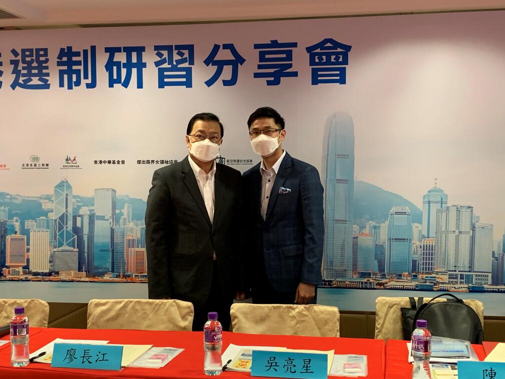 曹錦昌先生以IGU創專薈主席身份出席由香港商報主辦的全國兩會精神暨完善香港選制研習分享會,與譚耀宗合照。