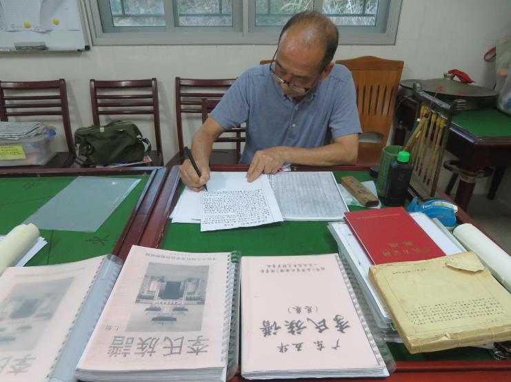 李雲亮重抄老族譜時專心致志,一旁放有其他李氏族譜作參考。 記者 鄭玉君攝