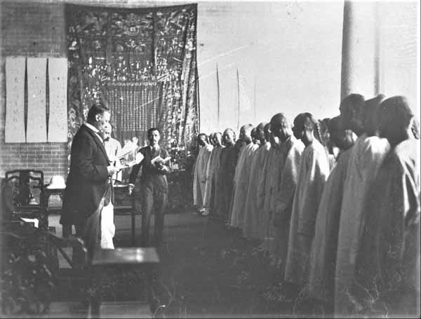 1899 年,時任港督卜力爵士向屏山紳耆演說。右排的鄉紳父老都穿上長衫。香港政府檔案處圖片