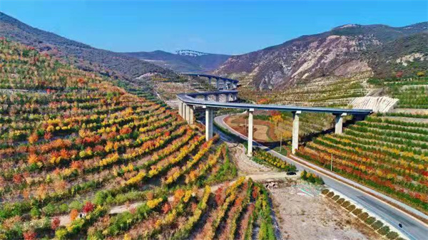 天龍山公路兩側層林盡染,楓葉如霞似火