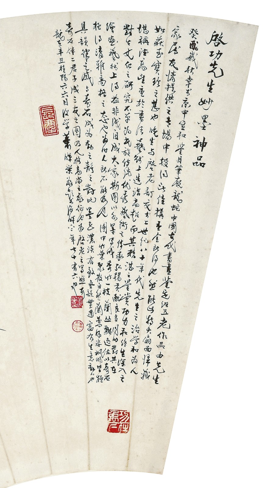 蕭暉榮是啟功生前之忘年交,啟功於蕭教授亦師亦友,常一同探研藝事。蕭教授購得此「啟功先生妙墨神品」後非常歡喜,題長跋說明因由,並高度讚揚啟功先生的高超藝術造詣及高尚品德:「癸巳(2013年)歲秋,幸於京中『宣和鑒目 筆底龍蛇』中國古代書畫鑒定組五老作品,由先生家屬友情提供之專場中,投得此佳構,重金所得也。然能此特大扇面歸藏,如獲至寶,珍之甚也。晚生與啟老訂交於上世紀八十年代,先生之治學和為人堪稱德高望重,於書法藝術上造詣高超。而其精湛之鑒賞功力和終生深入對古文化之研究,不單為民族傳統優秀藝術之傳承弘揚貢獻良多,同時對其在繪畫藝術上得益非淺,自成大家。斯圖以水墨寫成,秀竹一枝,蘭叢飄逸,佐以奇石,極得清雅高格之態也,為時人所不能及也。圖中竹葉聚散自然,蘭蕙風姿颯颯,皆極具韻律之感,與壽石成為動之靜之對比。墨色濃淡有致,氣韻貫通,富有生意,動人也。奇石伴二君子,成三友之圖,乃人格高尚之象徵也,為啟老之寫照耳。」(文:蕭芬琪)
