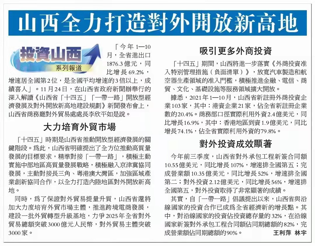 「今年1—10月,全省進出口1876.3億元,同比增長69.2%,增速居全國第2位,是全國平均增速的3倍以上,成績喜人」。11月24日,在山西省政府新聞辦舉行的深入解讀《山西省「十四五」「一帶一路」開放型經濟發展及對外開放新高地建設規劃》新聞發布會上,山西省商務廳對外貿易處處長李欣平如是說。