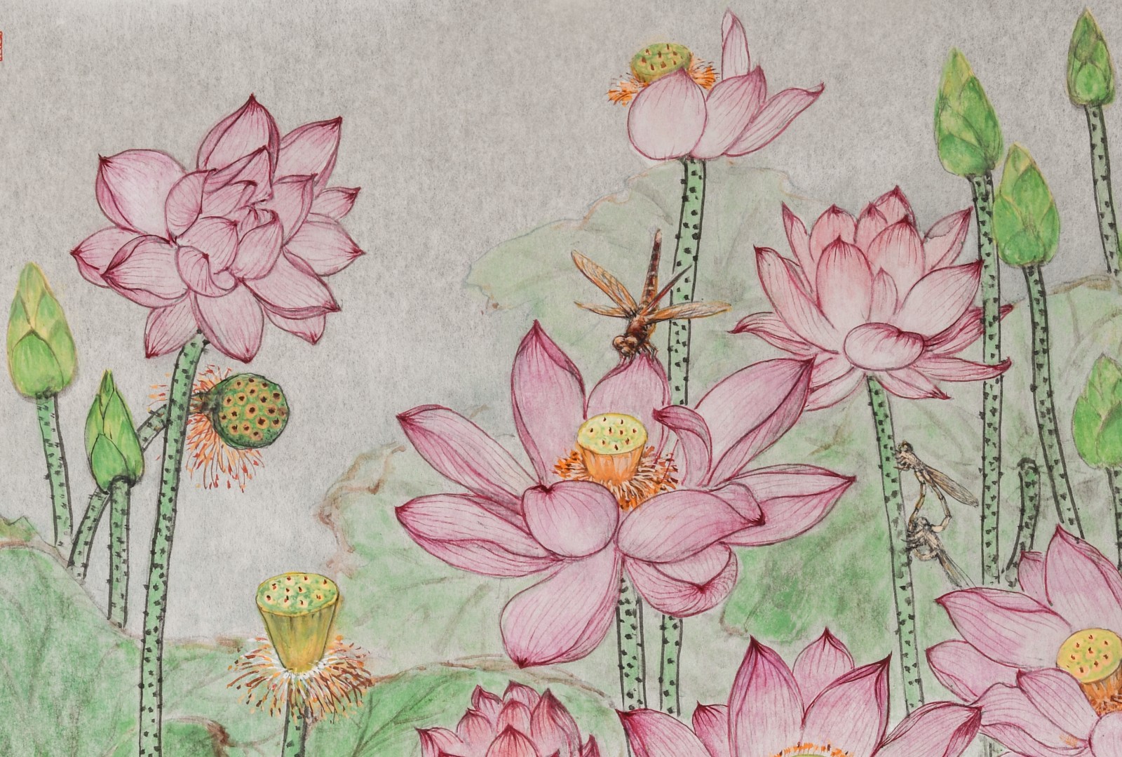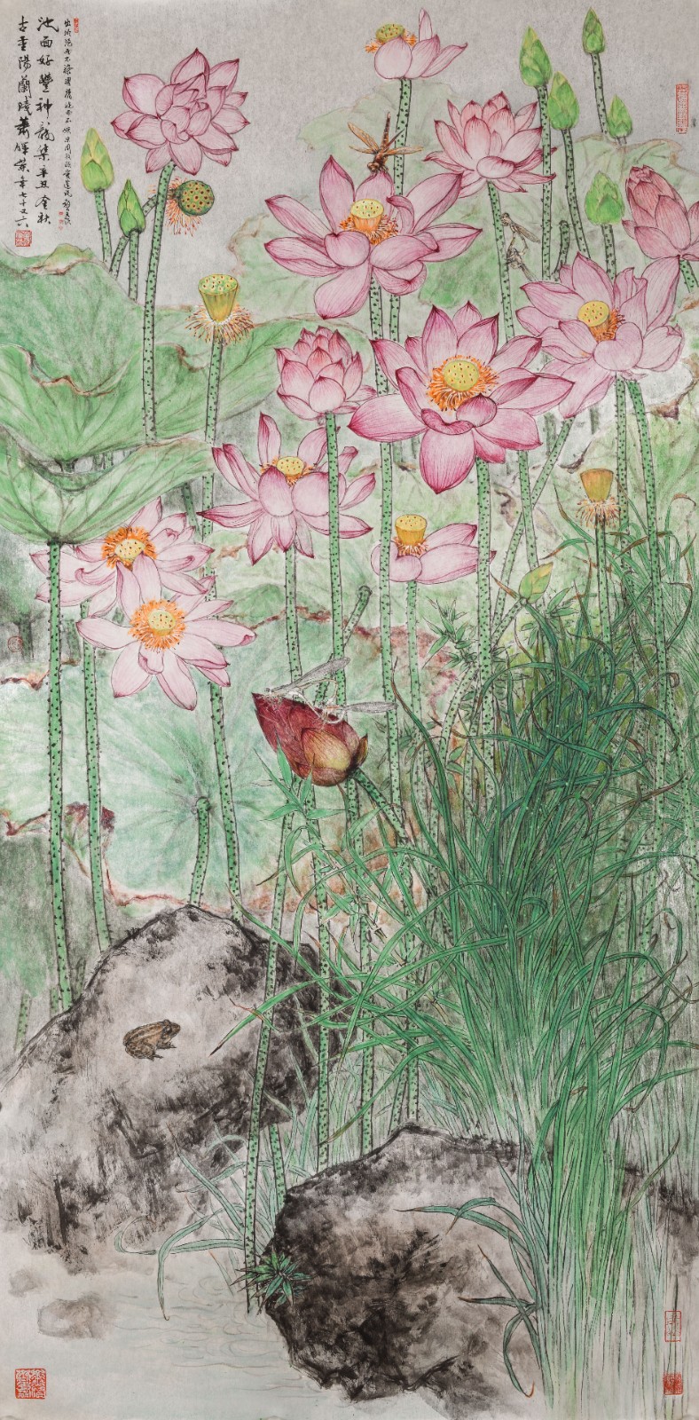 宋人周敦頤曾在《愛蓮說》中盛讚蓮之「出淤泥而不染」的高尚品質,在創作此銀箋作品時,蕭暉榮在「高潔脫俗」、「花中君子」的高標人格化的基礎上,賦予了荷花和諧繁盛的嶄新時代意義。他筆下的荷池正值盛夏,荷葉田田,繁花纍纍,香氣怡人。池中動物昆蟲跳躍飛舞,活靈活現,栩栩如生,恍如一場歡樂的嘉年華。蕭暉榮藉此美好盛景,寓意中華民族的欣欣向榮,傳遞其以祖國盛世繁華為傲的欣喜之情。同時,作者也藉着繁花似錦、朝氣蓬勃的畫面,表達對收藏者家族興旺、事業昌盛、家庭美滿的美好祝願。 (文:蕭芬琪)