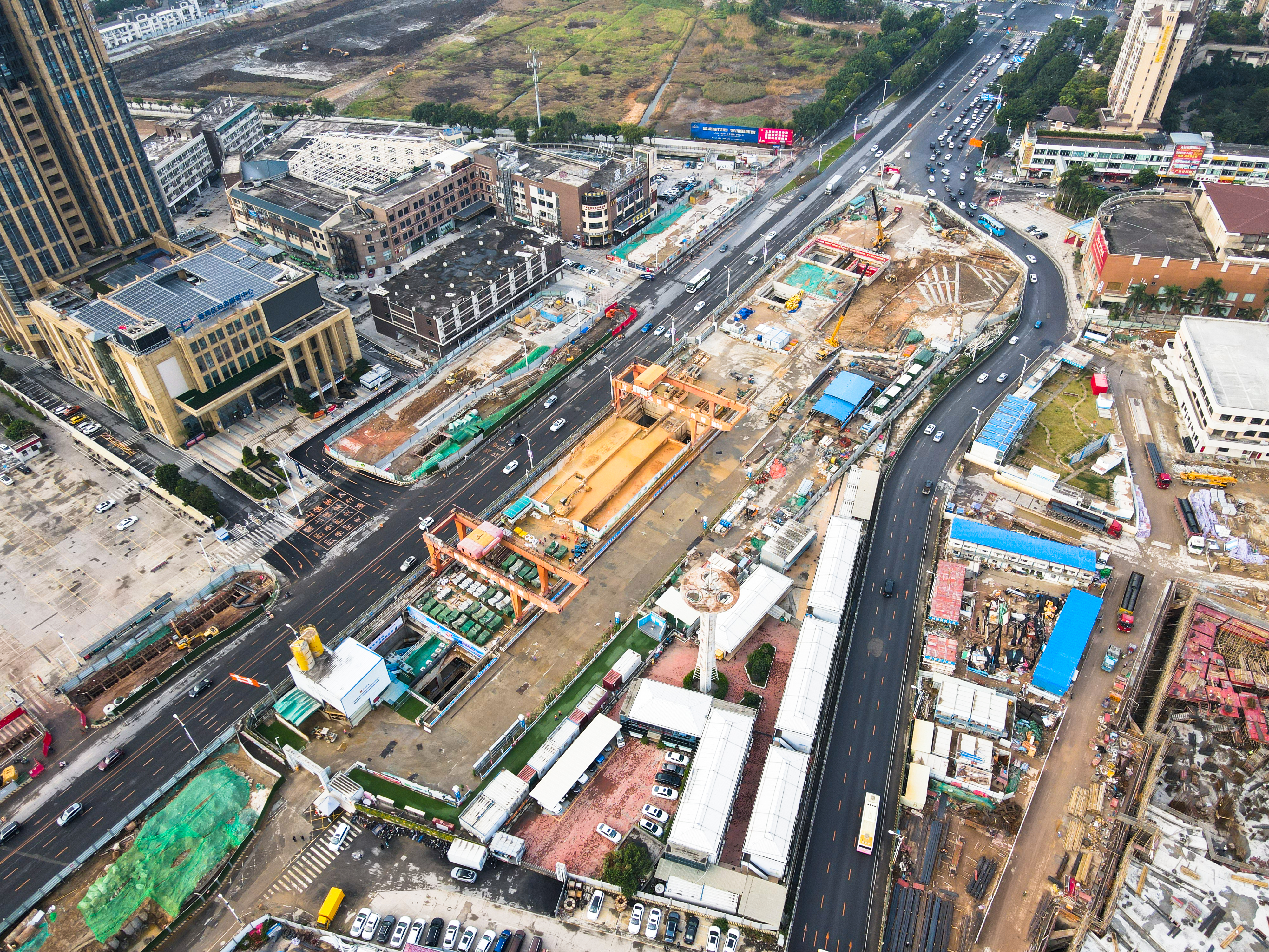 同日實現盾構始發的金光大道至廣州新城西站區間左線隧道全長約1450米,線路主要沿番禺區亞運大道穿行,隧道主要穿越中微風化花崗岩、砂質黏性土、淤泥、砂層等地層,地面先後經過河涌、側穿電塔等多處重要建構築物,地質條件和地面環境均比較複雜,同樣給施工帶來了巨大挑戰。
