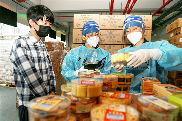 港珠澳大橋海關關員對輸內地的澳門製造特色食品進行監管。(俞波攝)