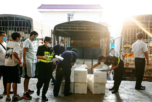 閘口海關關員檢查供澳鮮活產品。(俞波攝)