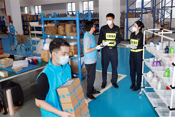 青茂海關關員監管跨境電商進口商品。(俞波攝)