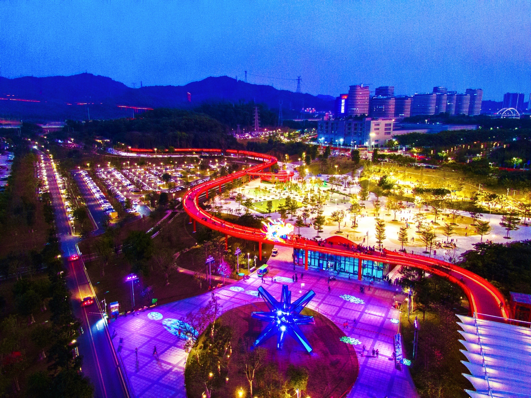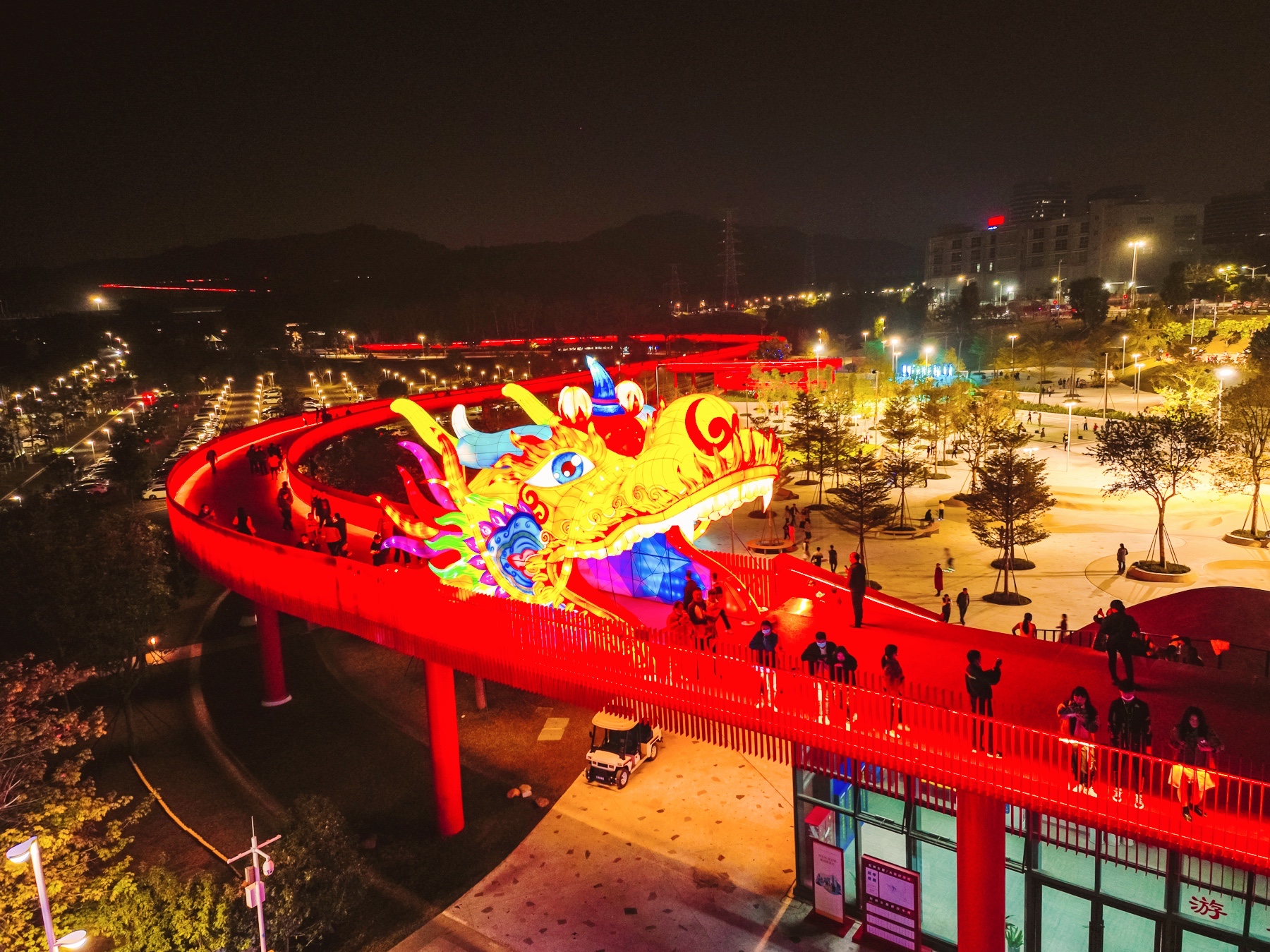 17:30,在光明虹橋公園廣場中心,在做好疫情防控的同時,一場盛大的「虹龍點亮」儀式讓虹橋公園華麗變裝。在新年的夜幕中,虹橋公園北入口平台上氣勢巍峨的「龍頭」和全長4公里虹橋瞬間點亮,一條西起新城公園,東接馬拉松山湖綠道,在光明的山水林田中蜿蜒4公里的紅色巨龍展現出了它在夜空之下的蛟龍身姿,一個以虹橋為中心的超大型城市藝術裝置仿佛被賦予了新生命,在2022年元旦之夜大放光明,帶來瑞龍呈祥的新年祝福。