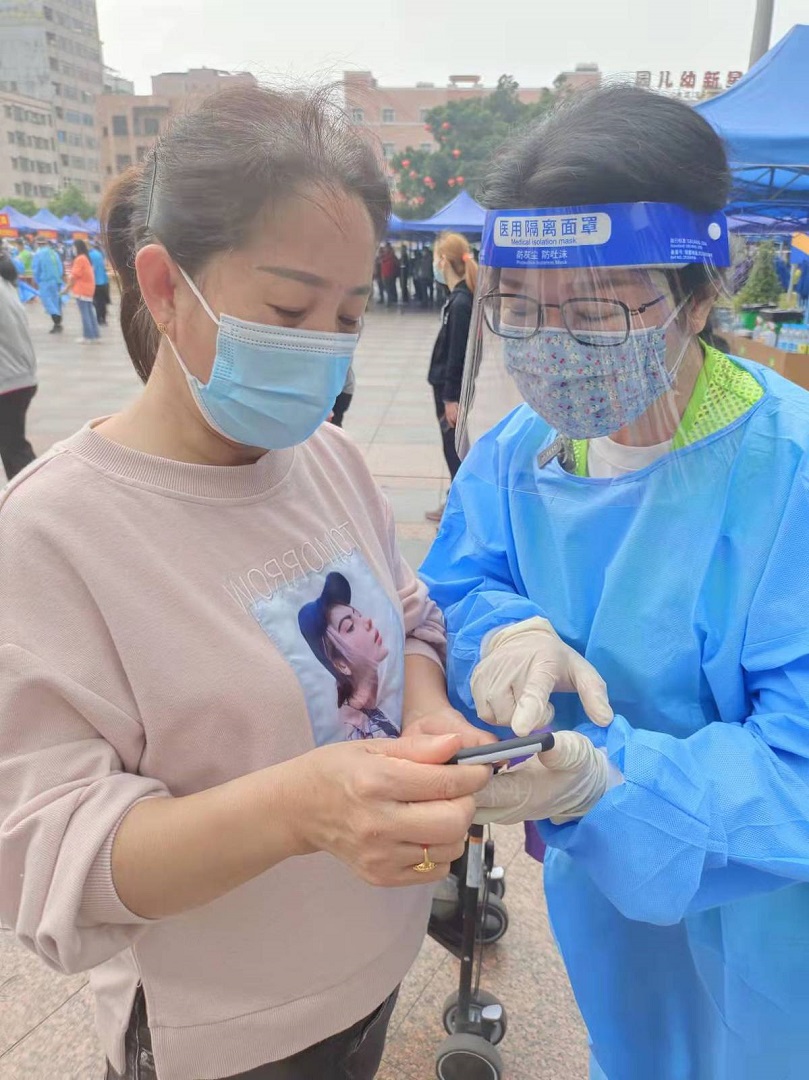 在龍眼文化廣場,一位穿着防護服,正教一名上了年紀婦女手機提起核酸碼的女子引起了記者的注意,因為在她的防護服上,寫着「香港」兩個字。她也是志願參加疫情防控服務工作的虎門內地港人聯誼會會員。