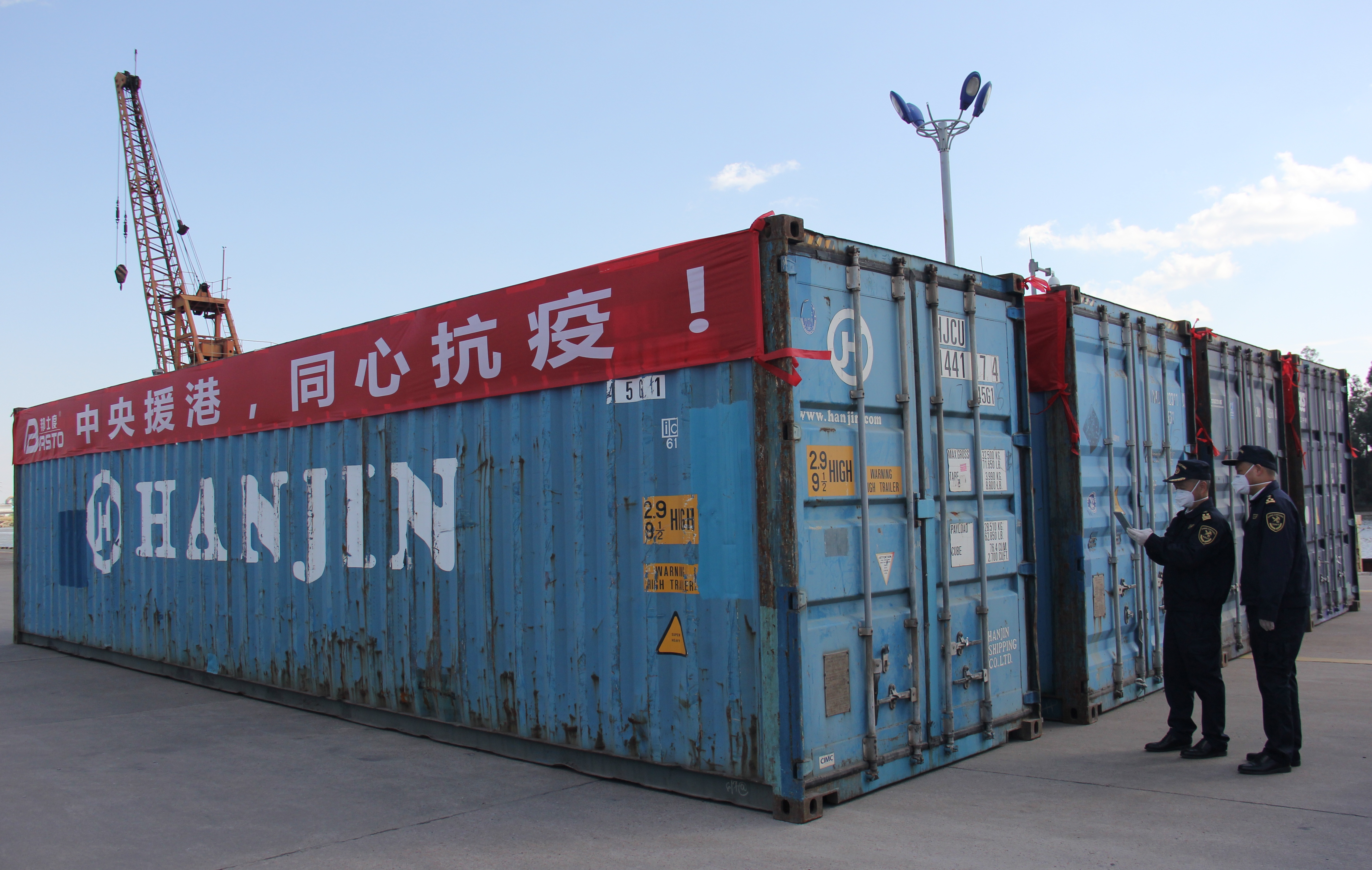 3月7日,在廣州海關所屬花都海關的監管下,13個集裝箱的醫用隔離面罩、醫用隔離眼罩快速驗放,裝船從花都港通過水運發往香港。據悉,這批物資於3月8日凌晨運抵香港,由香港特別行政區政府接收後向一線工作人員分配。