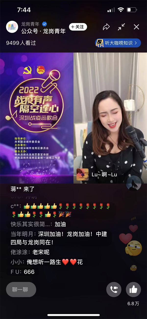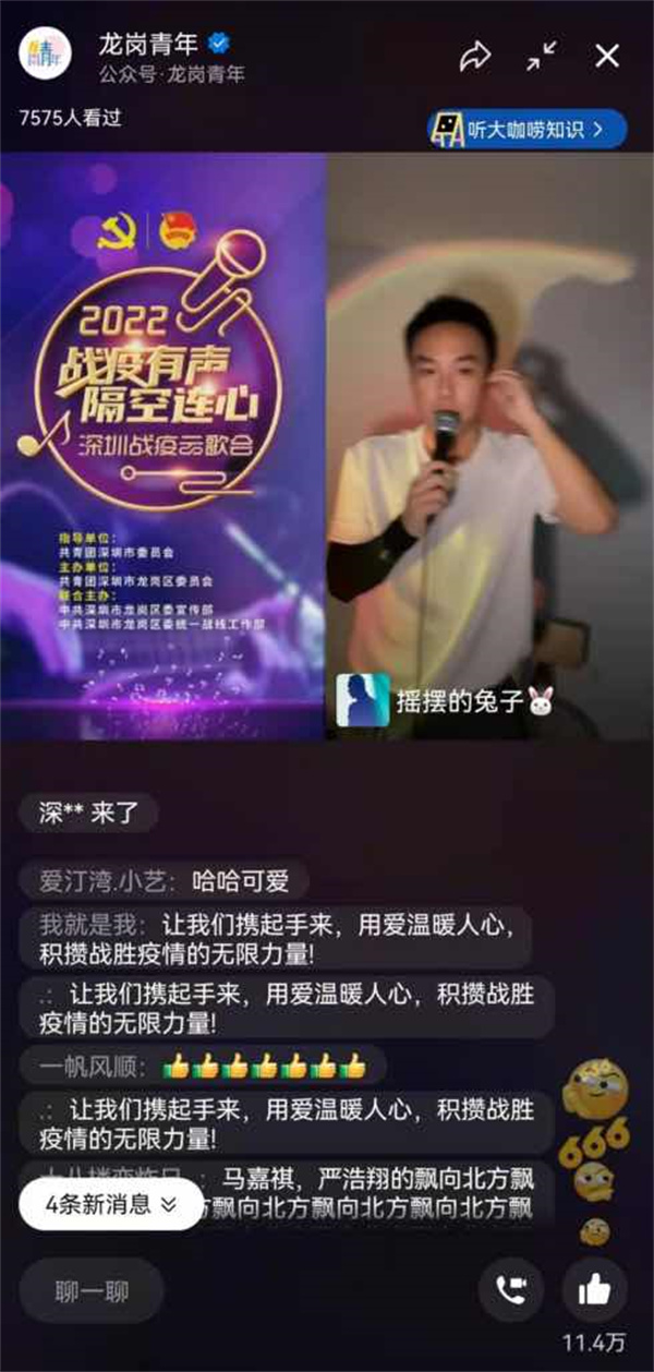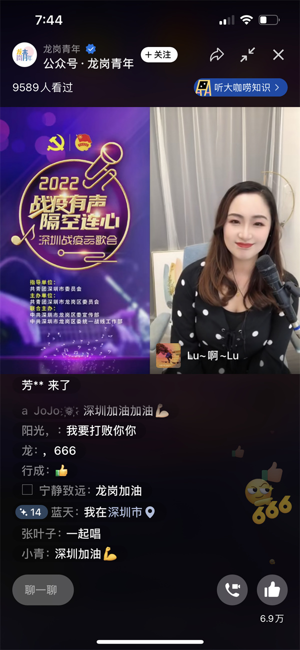 記者近日從深圳團市委獲悉,為致敬無數奮戰在一線的工作人員、志願人士,在深圳團市委的指導下,龍崗團區委聯合龍崗區委宣傳部、龍崗區委統戰部,重磅打造「『戰疫有聲 隔空連心』2022深圳戰疫雲歌會」,於3月16日至20日每晚19:00-22:00在「龍崗青年」微信視頻號開通雲直播室,組織龍崗區夢想義工藝術團優秀歌手連麥「駐唱」3小時不停歇!活動首場直播已於16日19時開啟,直播期間觀眾量達2.1萬餘人,點讚量近23萬次。