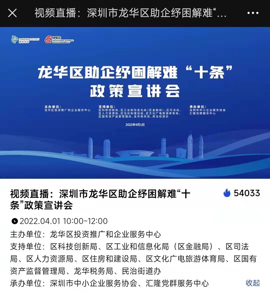為真正落實「十條」惠企政策,切實幫助深圳龍華區內企業更好了解及申請政策資金,助力轄區市場主體紓困解難、提振信心,4月1日,深圳龍華區9部門聯合組成豪華「惠企宣講團」,由各部門政策負責人詳細解讀助企「十條」政策,進一步減輕企業負擔,讓惠企落地一次性聽全聽懂。