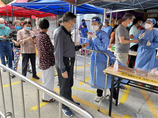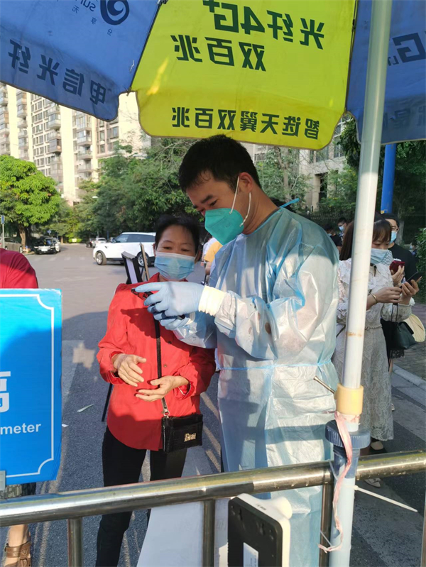 連續參與防疫志願服務的還有廣州地鐵建設公司第七建管部的共產黨員王亮。自4月8日以來,王亮每天都會到社區報到,然後根據安排參與其所在的金沙街道御金沙社區瀾西街的核酸檢測工作,負責查驗居民的健康碼、核酸碼和提供指引。