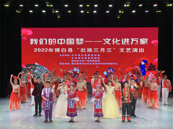 玉林博白縣組織了「我們的中國夢」——文化進萬家活動之2022年博白縣「壯族三月三」文藝演出,在「雲端」進行了4天的展播,節目內容包括具有民族特色的歌曲、舞蹈、雜技以及桂南採茶戲等,進一步傳承和弘揚了博白優秀的傳統文化,營造了濃厚的民族團結進步氛圍。