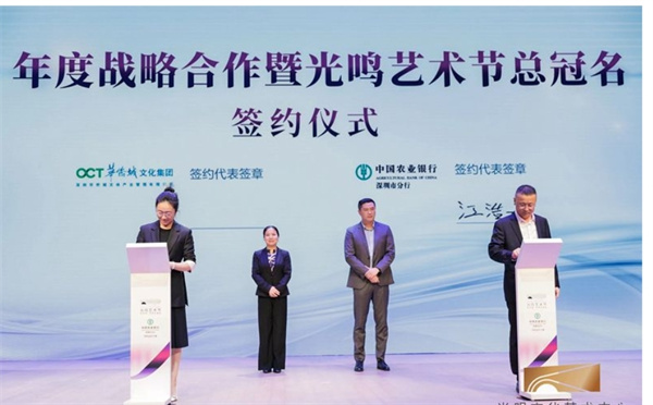 光明文化藝術中心作為光明區高質量高顏值發展建設的文化地標,為光鳴藝術節提供了全程的創意支持和籌備實行,場館運營管理團隊深圳華僑城文體產業管理有限公司黨支部書記、總經理朱倩與中國農業銀行深圳光明支行黨委書記、行長江浩立在活動現場簽署了年度戰略合作暨光鳴藝術節總冠名合作,讓科技與人文交相輝映,以安全便捷的金融服務支持文藝生活,用繁榮的文化激發城區發展活力。