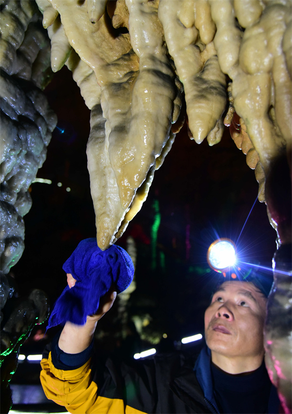 「鐘乳石上有苔蘚、氧化物和灰塵,要及時進行清理,保持它的原貌,就像漂亮的臉蛋經常要修飾一樣……」在湖南張家界市武陵源區黃龍洞景區的溶洞內,正在為鐘乳石做「美容」的保潔工毛國平吸引了眾多遊客的圍觀,面對大家的好奇心,毛國平風趣地說。
