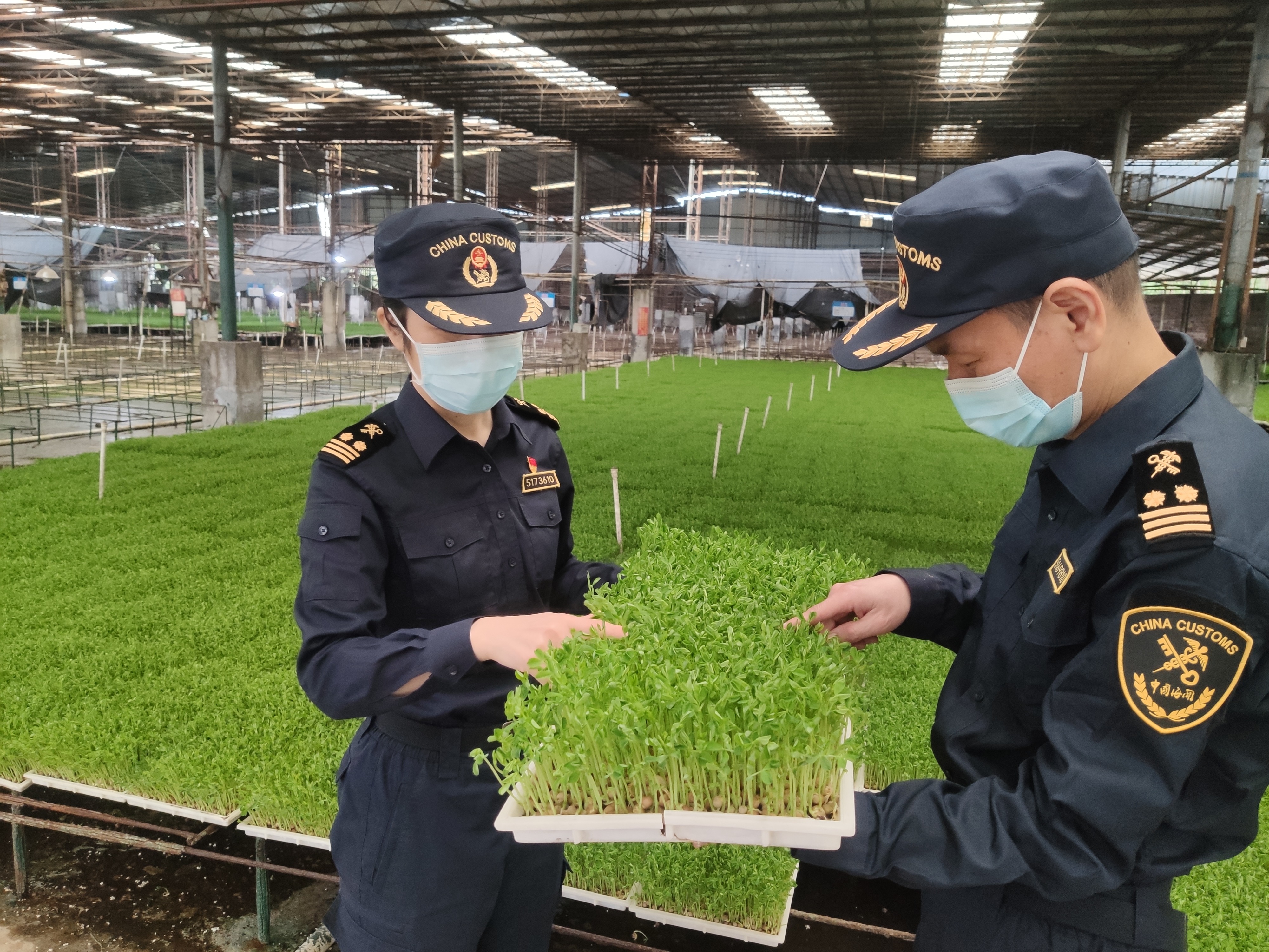 廣州海關關員對出口豆苗衛生情況、數量等進行檢查