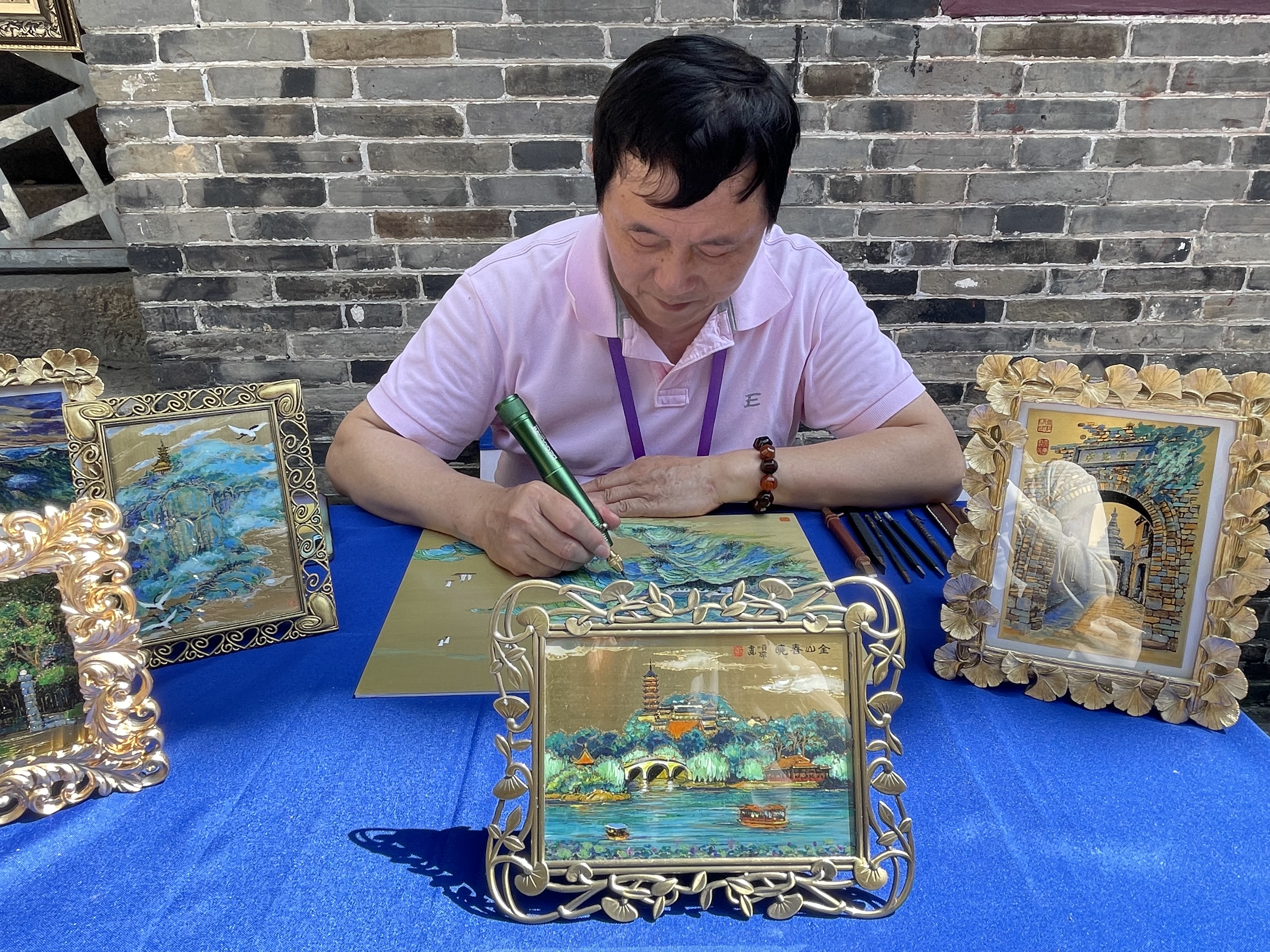 「反覆刻畫、反覆上色,在銅板上鑿出明暗變化,是很辛苦的過程,要完成一幅作品並不容易,想要學會這門技藝,不僅要會畫,而且要有極強的耐心。」康順偉說,把家鄉的自然人文風景通過獨特的形式呈現,非常有意義。除了城市的人文風景,他創作的作品中還包含了京劇人物、花鳥、民間工藝,最新根據春晚舞蹈節目創作的《只此青綠》更是廣受歡迎。