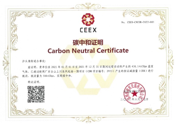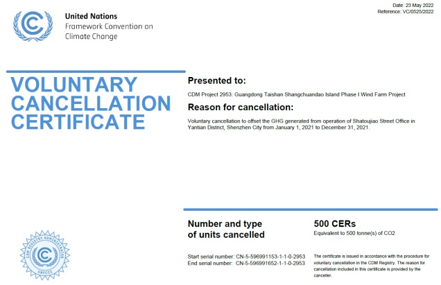 活動上,全體觀看了全國低碳日宣傳片,隨後,深圳市生態環境局鹽田管理局宣布沙頭角街道辦2021年實現「碳中和」,並為其頒發碳排放抵消證書和碳中和證書。沙頭角街道辦在深入實施節能降耗的基礎上,通過購買聯合國清潔發展機制下的廣東省台山上川島風電場一期項目產生的核證減排量進行剩餘碳排放量抵消,實現了碳中和。