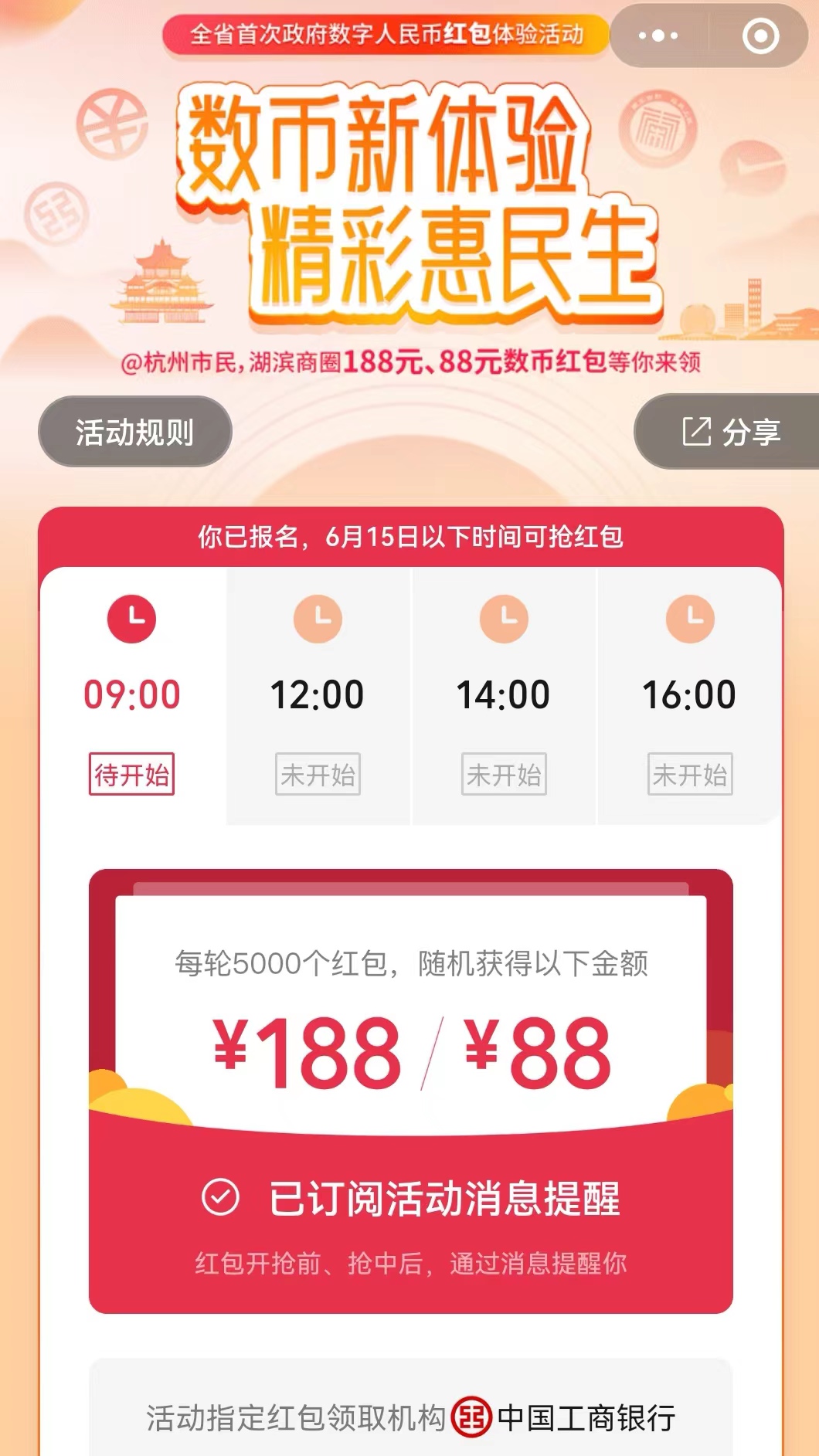 本次活動由杭州市上城區人民政府、工商銀行杭州分行聯合主辦,微信支付提供技術支持。6月13日10時至6月14日24時,個人客戶可通過“數字人民幣紅包助手”微信小程式參與報名。需要注意的是,報名時,客戶需身處杭州市城區(桐廬、建德、淳安除外)。