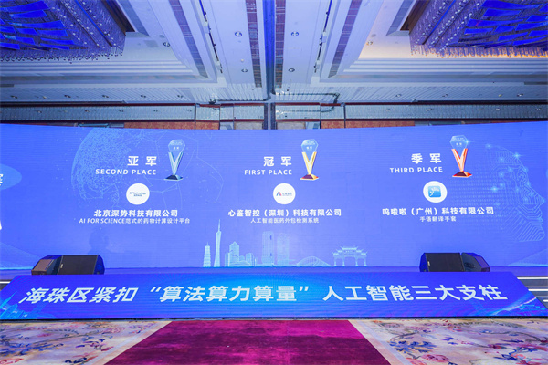 6月22日,首屆廣州·琶洲算法應用國際大賽頒獎典禮暨算法產業峰會在廣州琶洲舉行。經過激烈角逐,心鑒智控(深圳)科技有限公司、北京深勢科技有限公司、嗚啦啦(廣州)科技有限公司分別獲得首屆廣州·琶洲算法應用國際大賽冠亞季軍,另有深圳小庫科技有限公司、廣東茉莉數字科技集團股份有限公司、北京大數醫達科技有限公司獲得大賽典型實踐獎,廣州雲蝶科技有限公司、訊飛幻境(北京)科技有限公司、工數科技(廣州)有限公司等12家公司獲得大賽卓越創意獎獲,中國移動通信集團廣東有限公司廣州分公司獲得大賽最佳人氣獎。