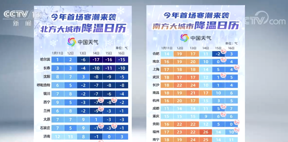 從大城市降溫日曆來看,13日開始,降溫劇烈的城市主要集中在東北、黃淮、西北等地,像哈爾濱的最高氣溫將從2℃降至-17℃,石家莊、濟南將從8至9℃跌至冰點之下,都是隔天如換季。