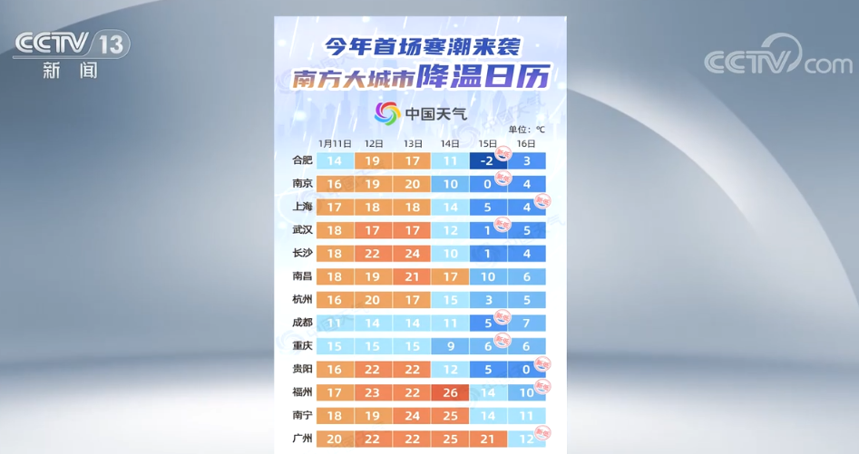 根據中央氣象台預報,此次寒潮影響期間,我國共有13個省會級城市累計降溫幅度可超15℃。13至14日,北方大部將陸續進入核心降溫時段;南方的降溫要滯後一些,在15日前後,但降溫幅度強烈,累計降幅超15℃的區域比比皆是。