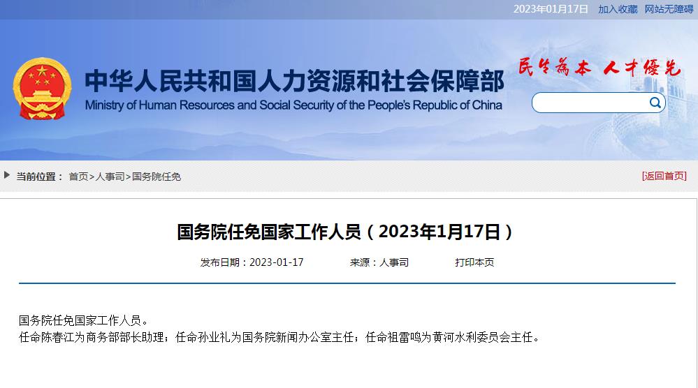 據人社部網站17日消息,國務院任免國家工作人員。任命陳春江為商務部部長助理;任命孫業禮為國務院新聞辦公室主任;任命祖雷鳴為黃河水利委員會主任。